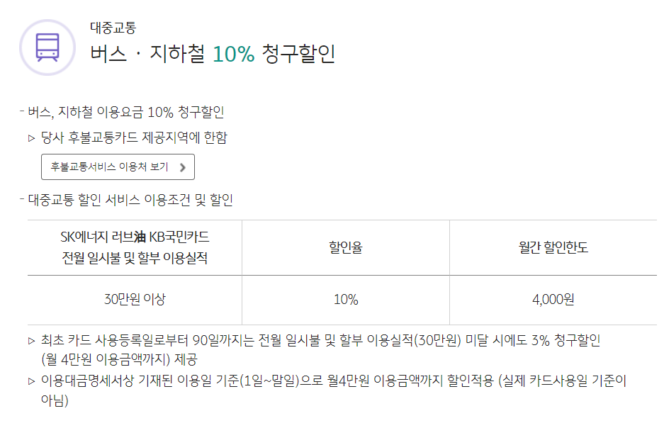 버스 / 지하철 대중교통 이용요금의 10% 할인 혜택을 받을 수 있구요